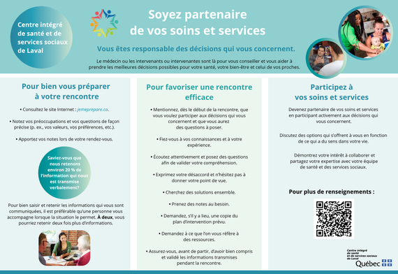 Le CISSS de Laval invite les professionnels, les médecins, les usagers et les proches à développer un partenariat. Pour y parvenir, tous doivent collaborer et communiquer efficacement; en se préparant avant une rencontre, en posant des questions pour s’assurer d’une meilleure compréhension et en étant ouvert et à l’écoute.