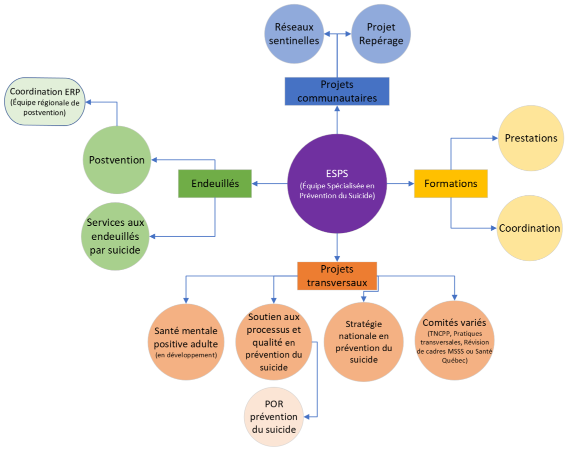 À travers différents services, l‘ESPS dessert l’ensemble du réseau local de services (RLS), les milieux de travail et la population touchée par un suicide, afin que la région demeure un chef de file en prévention du suicide. De plus, les mandats spécifiques de l’ESPS rendent possibles l’appropriation des meilleures pratiques par les intervenants.