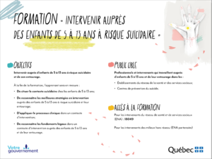 Pour les intervenants ayant suivi la formation Intervenir auprès de la personne suicidaire à l’aide des bonnes pratiques (21h) : Une mise à niveau de 3,5 h (virtuel synchrone) est disponible. Elle est recommandée aux personnes qui ont été formées entre 2015 et 2024 et ayant une expérience significative avec les outils.