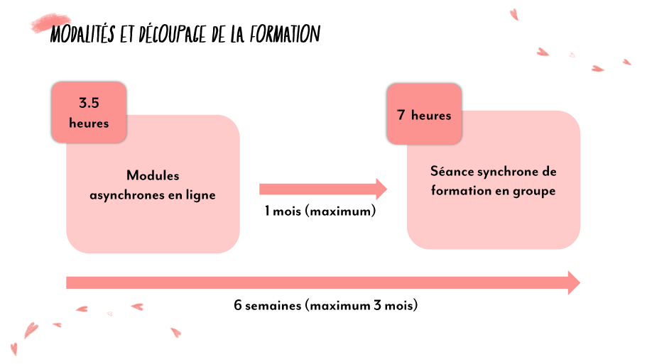 Formation offerte en partie sur l’ENA (10 h) puis avec un formateur accrédité en virtuel synchrone ou en présentiel (10,5 h ) Total : 20,5 h