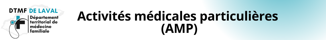 Tout médecin omnipraticien qui exerce dans le cadre du régime d’assurance maladie doit s’engager à effectuer une partie de sa pratique dans des activités médicales particulières (AMP) déterminées par le DTMF et le MSSS. L’entente particulière qui s’y rattache, l'Entente particulière (EP-51) /typo3conf/l10n/fr/rtehtmlarea/Resources/Private/Language/fr.locallang_accessibilityicons.xlf:external_link_new_window_altText, découle d’une disposition de la LSSSS et en détermine les modalités d’application.