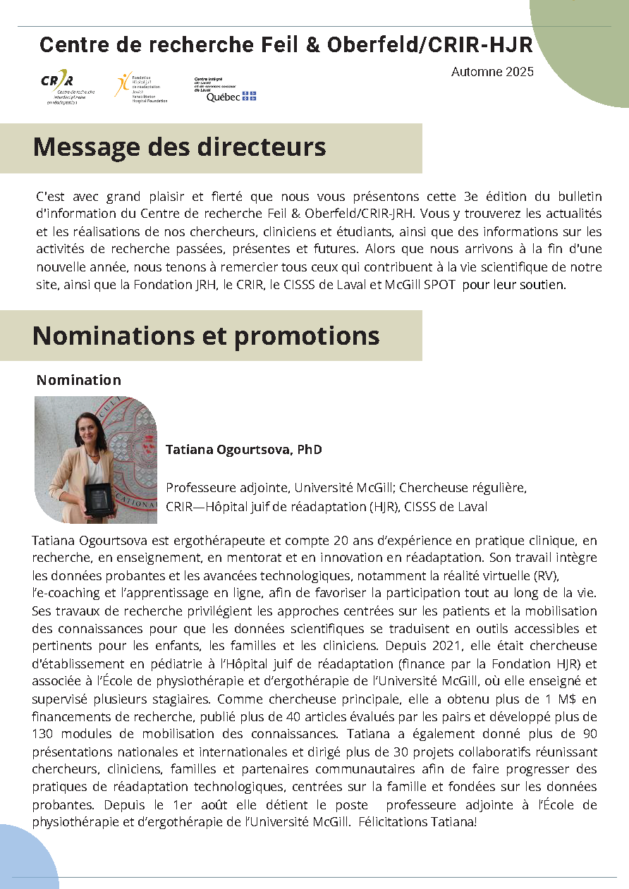 Le Centre de recherche Feil-Oberfeld à l'Hôpital juif de réadaptation du CISSS de Laval est l'un des quatre sites du Centre de recherche interdisciplinaire en réadaptation du Montréal métropolitain (CRIR).