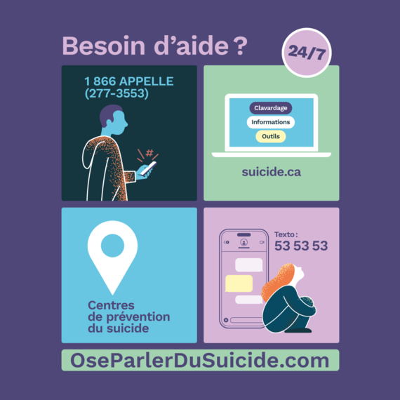 Vous pensez au suicide ou vous êtes inquiets pour un proche? Contactez les ressources disponibles 24 heures sur 24 et 7 jours sur 7. Des intervenants formés et compétents sauront vous aider.